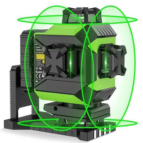 Huepar 704CG laser tool provides four 360° laser planes. The top horizontal line is for ceiling installation, while the bottom horizontal line is for floor tiling. One horizontal and one vertical 360° line intersect at 90°, allowing for quick and easy square layout. Short press the H/V button on the keypad to switch the horizontal and vertical laser lines separately.