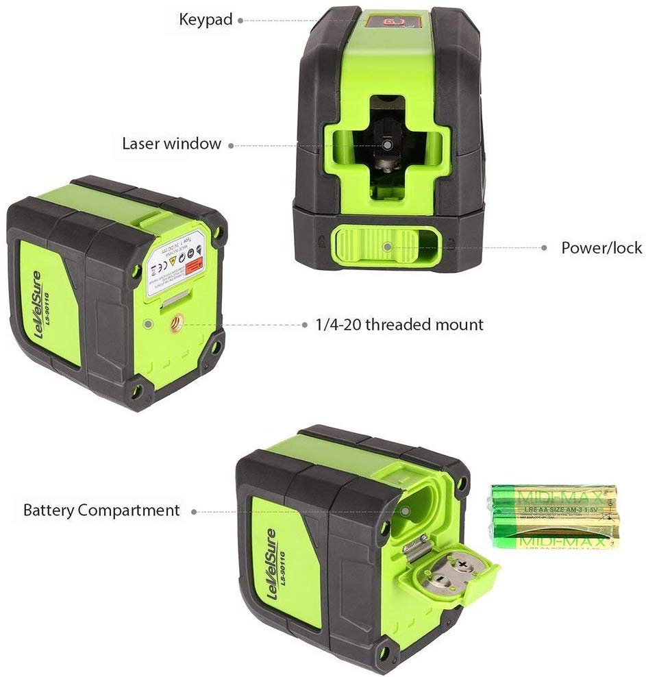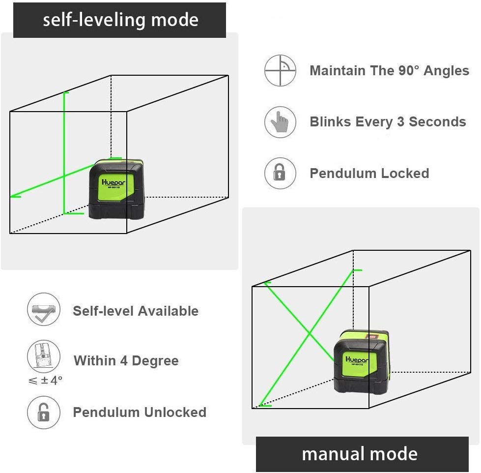 NUEVA TECNOLOGÍA DE DIODO VERDE: Adoptamos tecnología avanzada, hecha en Alemania, que es la mejor unidad de láser verde en la actualidad. El láser verde es 2 veces más brillante que el láser rojo con la misma fuente de energía. Cuando está nublado y la intensidad de la luz es 14000lux de ambiente, la visibilidad del Huepar 9011G es 10m.