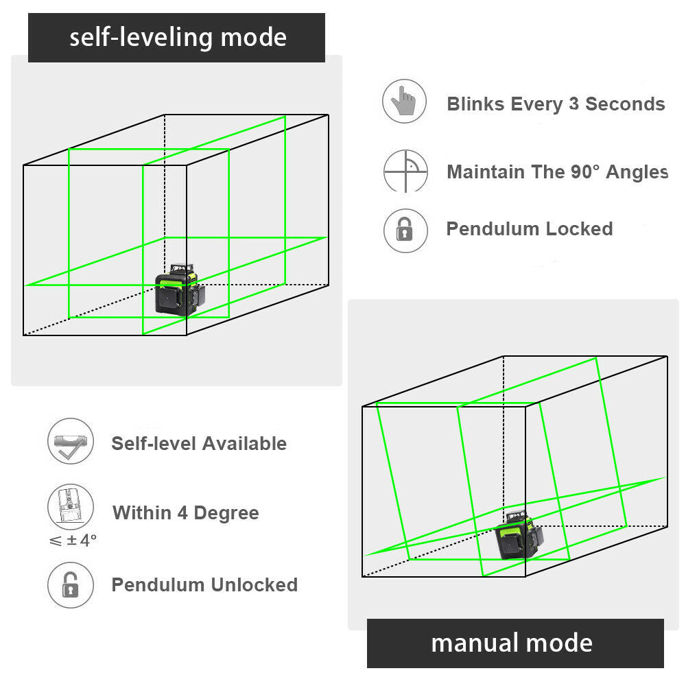El modo de pulso extiende el rango de trabajo hasta 60 m en condiciones más brillantes cuando se utiliza con el receptor de línea láser Huepar. Solo es compatible con el detector de láser Huepar LR-6RG / LR-5RG. Nota: Mantenga el modo de pulso activo cuando se utilice con un receptor.