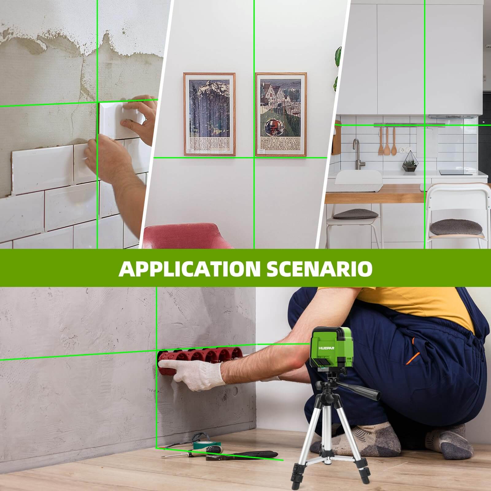 - 【Nivel láser de línea cruzada de alta precisión de 98 pies】El nivel láser Huepar adopta la tecnología Diode, emite un rayo verde brillante de Osram que proyecta una línea horizontal de 110° y una línea vertical de 110° cuando está en funcionamiento, proporcionando alta visibilidad hasta 100 pies de distancia con una precisión de ± 1/9 de pulgada a 33 pies (±3 mm/10 m). Este nivel láser de línea cruzada es ideal para pavimentar baldosas, instalar fotos, puertas, ventanas, carpintería de muebles, colgar papel tapiz, etc. Este nivel láser NO es adecuado para exteriores.