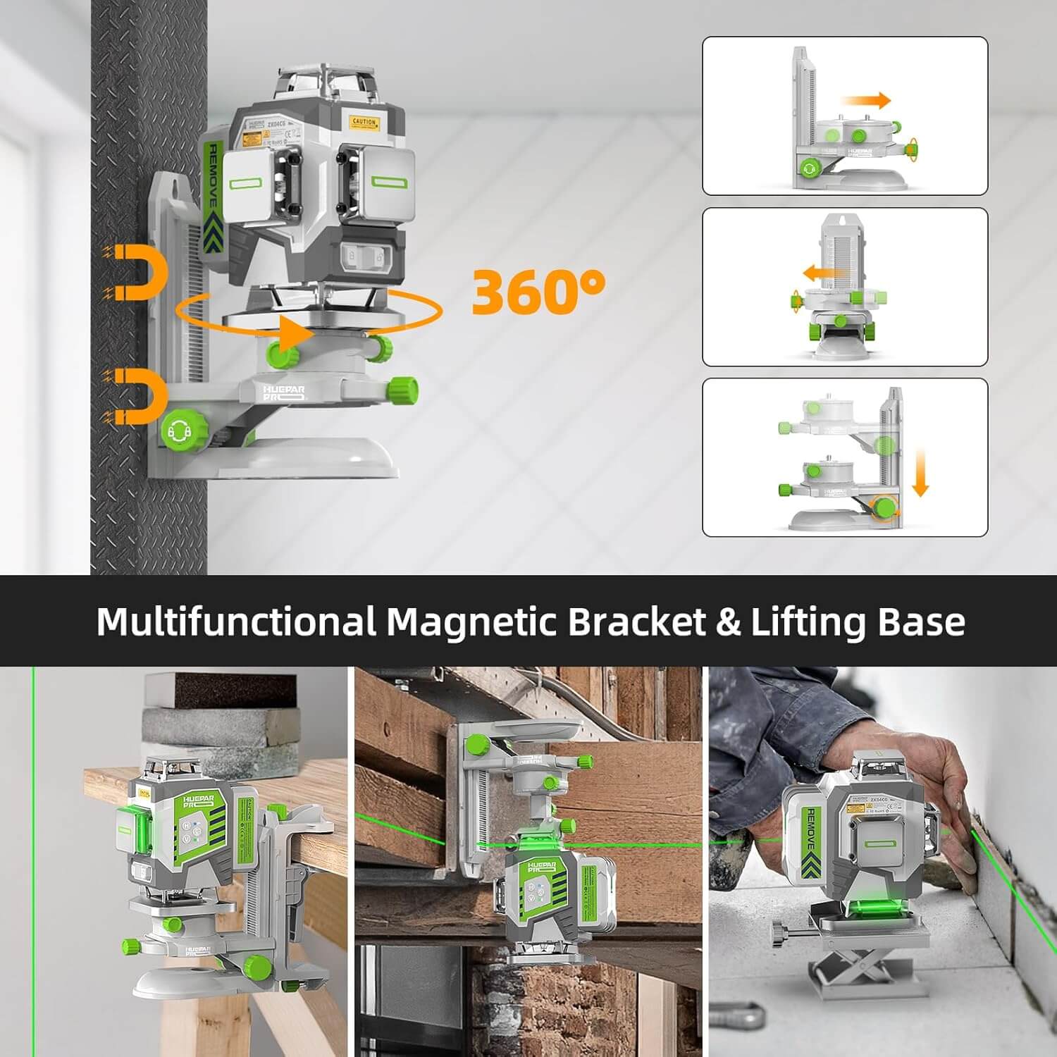El bracket magnético fuerte se adhiere rápidamente a superficies metálicas, permitiendo que la herramienta láser Huepar ZK04CG se monte para uso en paredes y techos. Los tornillos de ajuste fino ajustan la línea láser vertical, horizontal y rotacionalmente hasta 360°. El clip de ajuste posterior se adapta a objetos de hasta 5 cm de espesor y es compatible con la mayoría de las bases magnéticas para una estabilidad mejorada. El adaptador de ventana láser posiciona la herramienta más cerca de la pared, ideal para aplicaciones de techo. El bracket tiene tornillos de montaje 1/4"-20 y 5/8"-11 para tripie o montaje en poste, y la herramienta láser también tiene un tornillo de montaje 1/4"-20.