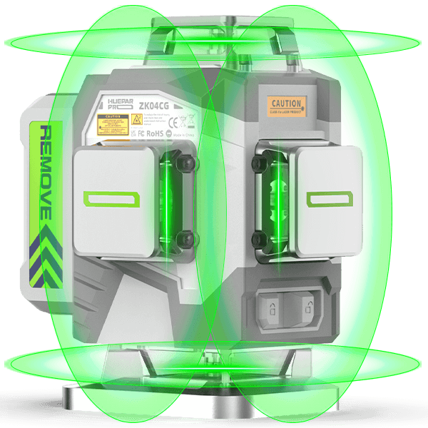 La herramienta láser Huepar ZK04CG está equipada con una batería recargable de 8000mAh, que proporciona hasta 8 horas de funcionamiento con todas las 4 líneas láser de 360° verdes activas. Tiene un puerto de carga Type-C, lo que le permite cargar la batería a través de un cargador de automóvil, banco de energía o otras fuentes. Los indicadores de batería le informan del estado de la batería en todo momento. Además, la batería removible incluye un puerto micro-USB, que puede usarse como banco de energía para cargar otros dispositivos, como un medidor de distancia láser o otras herramientas láser.
