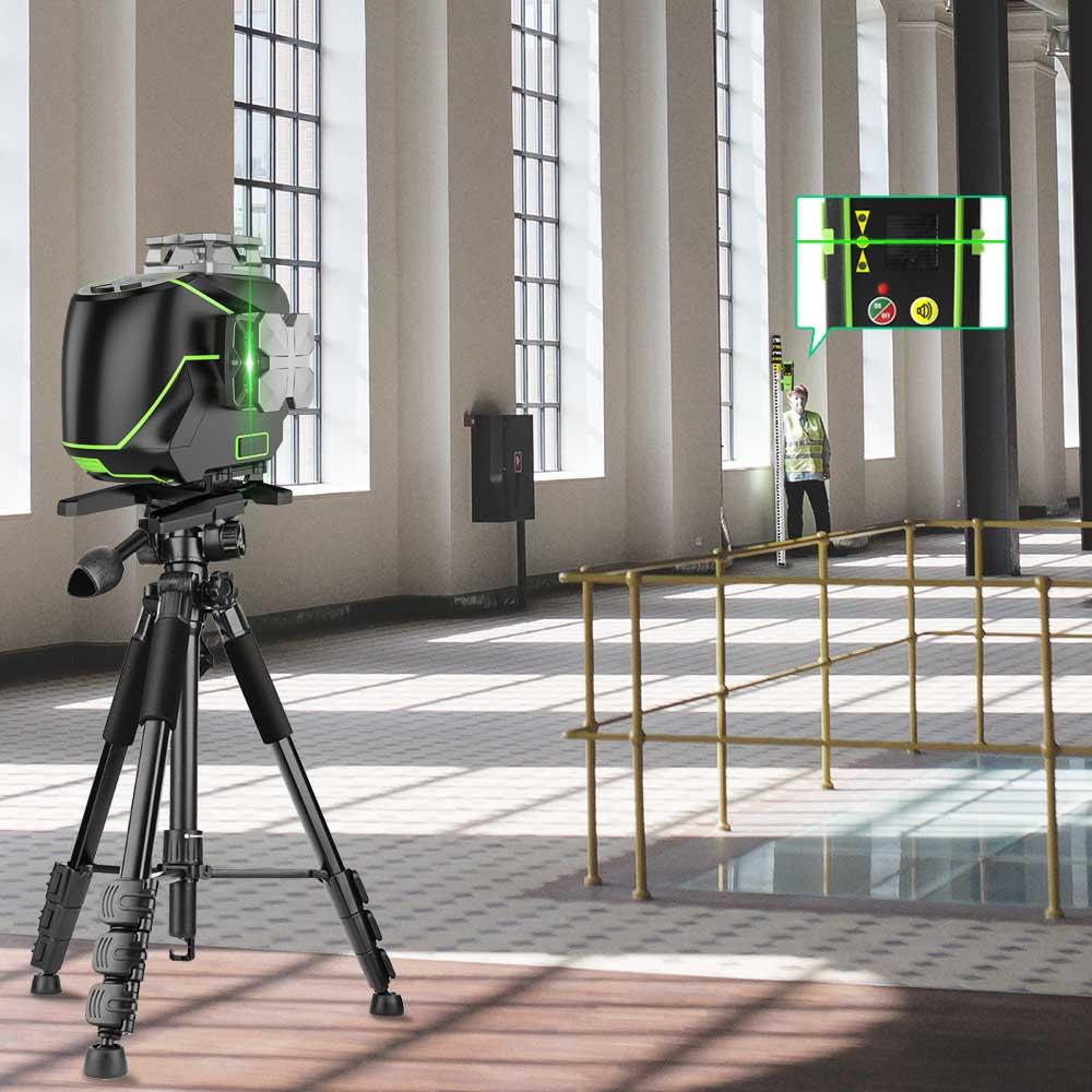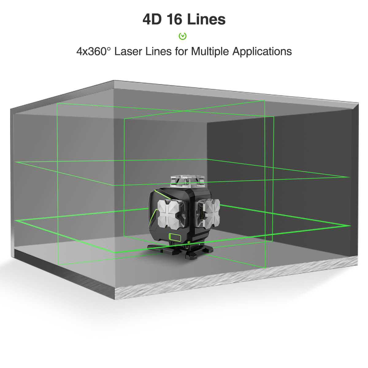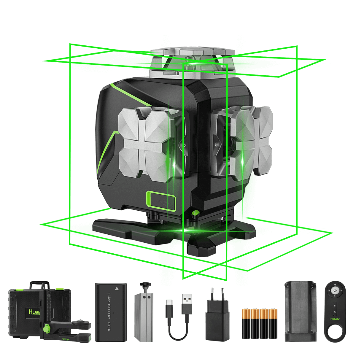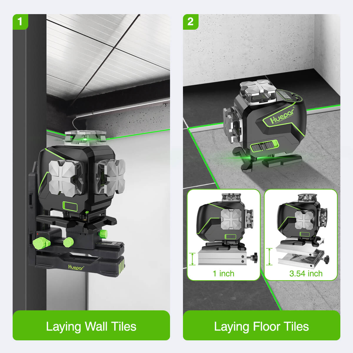 La herramienta láser Huepar S04CG tiene una línea horizontal superior de 360° para instalaciones de techo y una línea horizontal de 360° para baldosas. Su base de elevación permite que el láser de piso se eleve de 1" a 3.54" para proyectar sobre superficies irregulares. Este nivel láser de 4D ofrece cobertura completa para baldosas, piedra, ladrillo, alfombra y suelos de madera. Utilizando la tecnología láser verde de Osram, proporciona mayor visibilidad, mayor rango, mayor estabilidad y mayor eficiencia energética.