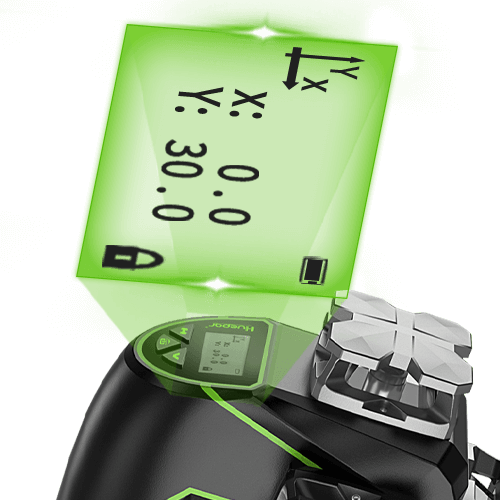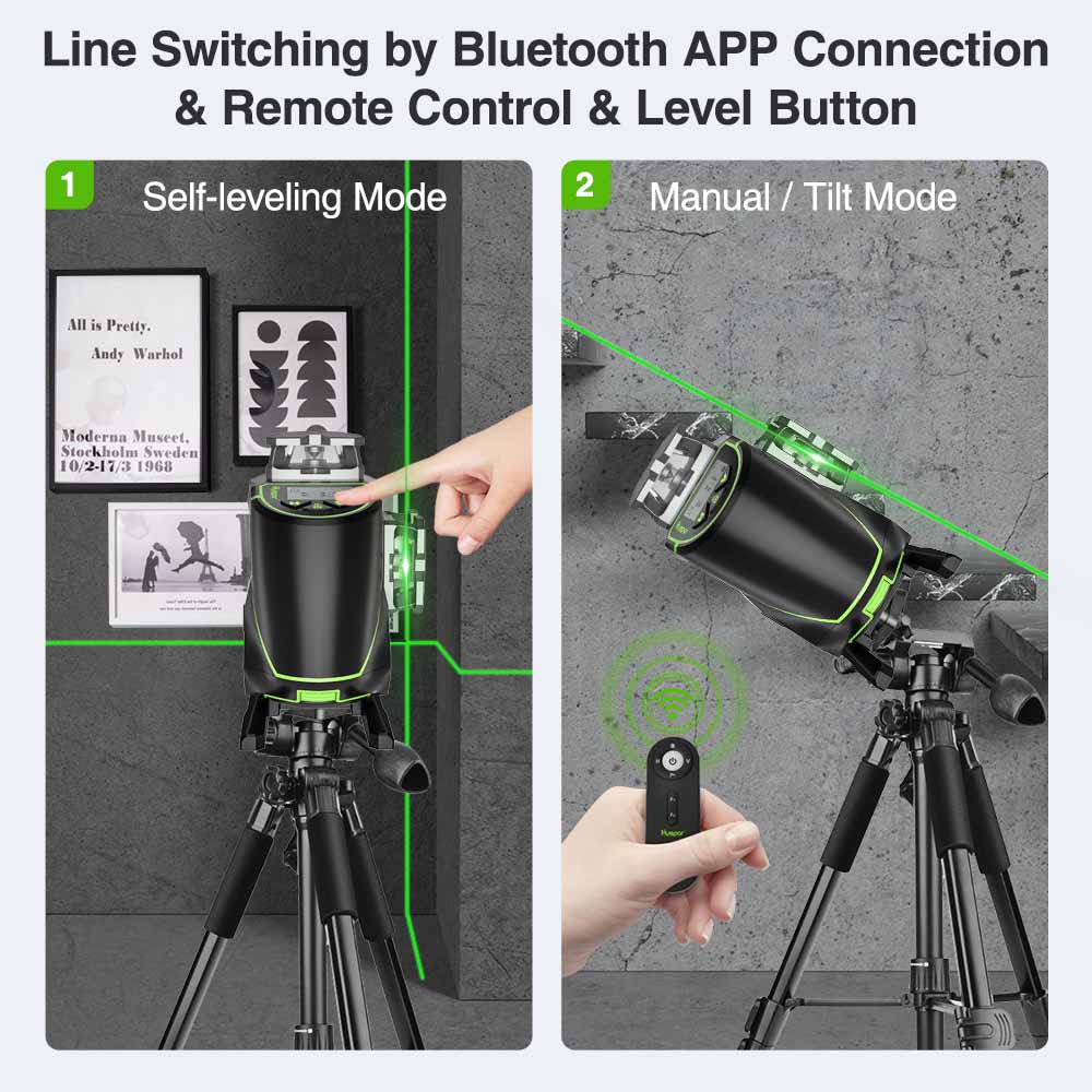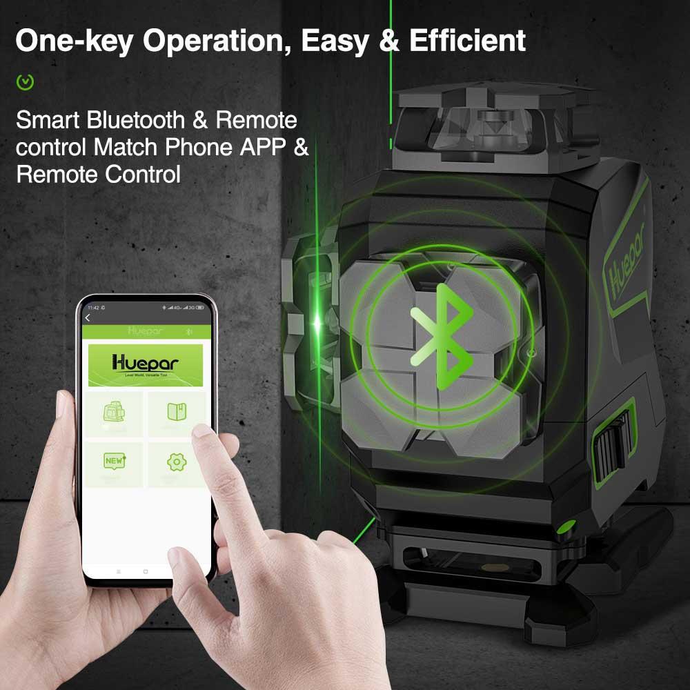 Presione brevemente los botones "H" y "V" en el teclado para cambiar entre líneas láser horizontal y vertical por separado. El control remoto Bluetooth o la aplicación Huepar permite seleccionar cuatro líneas láser de 360° individualmente hasta una distancia de 30 metros. Las líneas láser se pueden apagar temporalmente por el control remoto o la aplicación cuando sea necesario. En el modo manual, la herramienta láser se apagará automáticamente después de aproximadamente 5 minutos de inactividad cuando todas las líneas láser estén apagadas.