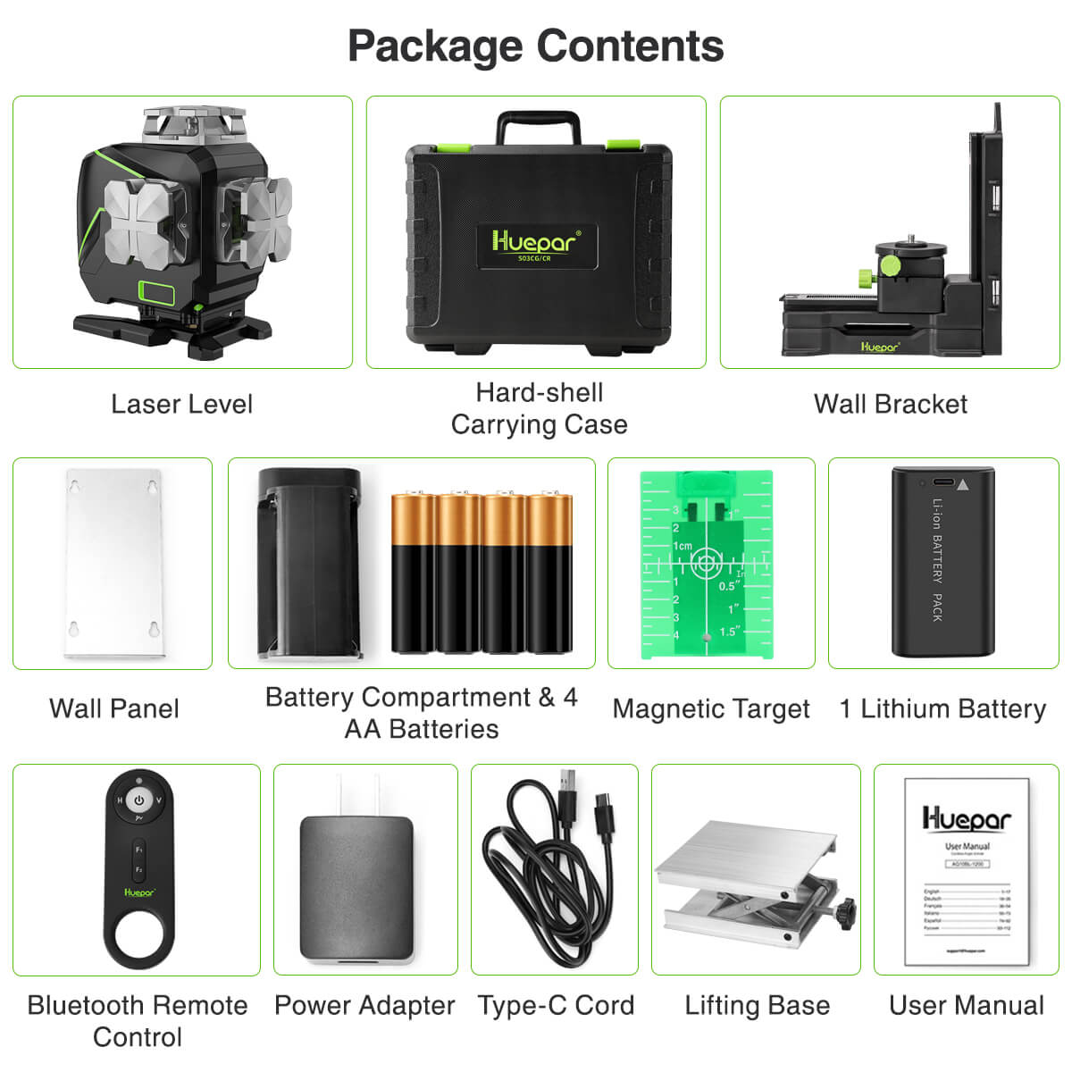 La herramienta láser Huepar S04CG utiliza una batería de iones de litio de gran capacidad compatible con la batería Samsung SB-L110. El nivel láser Huepar 360 también incluye un soporte para 4 baterías AA. El nivel láser de 16 líneas se puede usar directamente conectado cuando se retira la batería. Con un puerto de carga Type-C, el nivel láser también se puede cargar mediante un portátil, banco de energía, cargador de automóvil, etc.