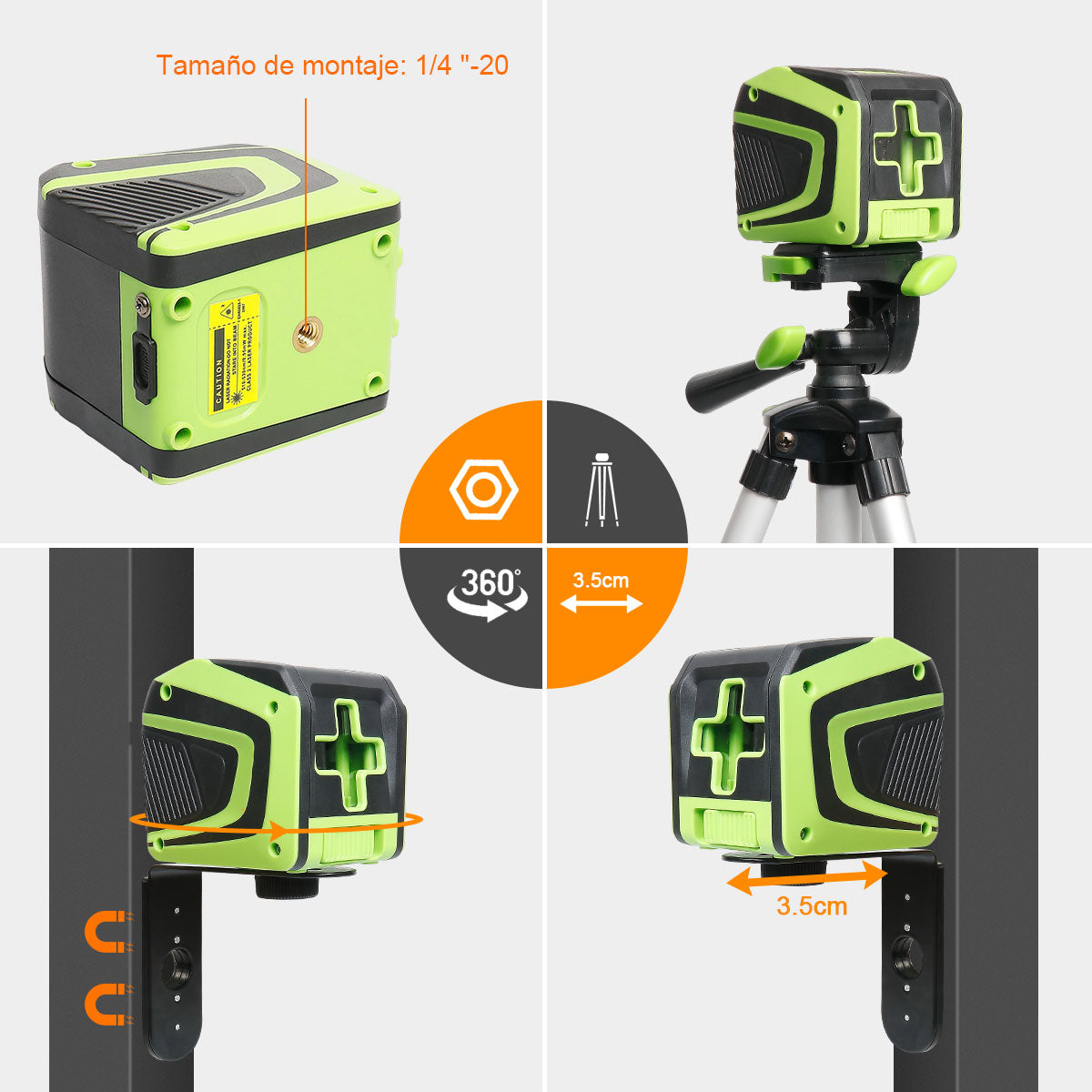 Montaje con rosca de 1/4 El láser de líneas cruzadas viene con rosca hembra de 1/4", lo que permite fijarlo a trípodes u otras bases de montaje para su posicionamiento.
