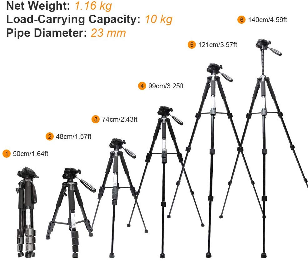Patas ajustables de 4 secciones y columna central: Hebilla de ajuste de altura de las piernas de cuatro secciones, columna central extendida para satisfacer sus diferentes necesidades. Rango de altura de 0.48m-1.43m, capacidad de carga de 10kg. Peso neto solamente 1.16kg, ligero pero durable. Fácil de llevar y transportar en una bolsa de almacenamiento.