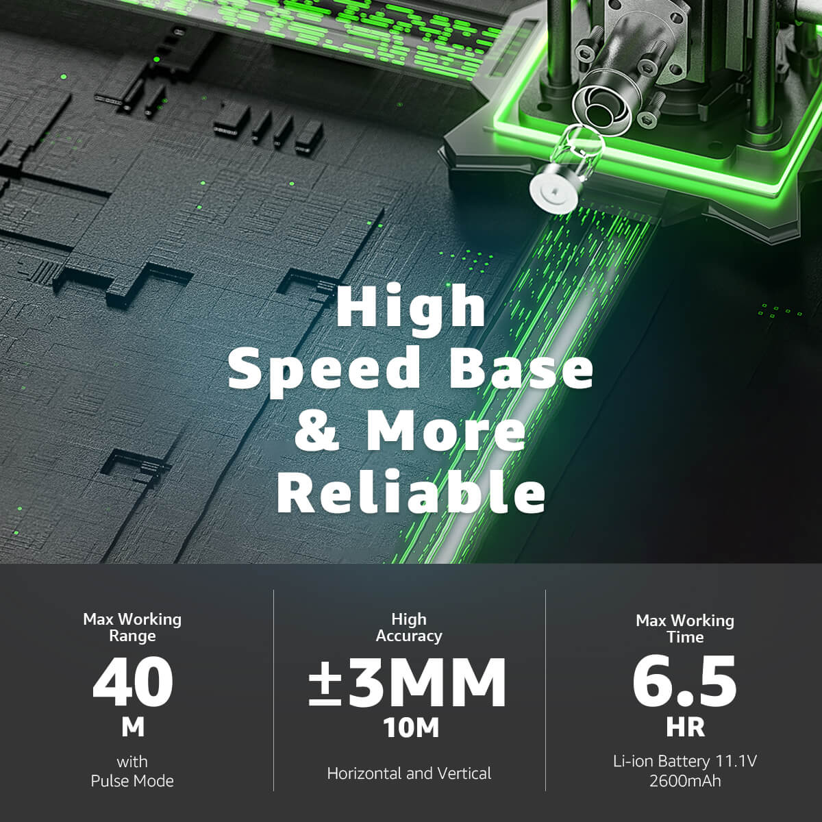 - El sistema de base de elevación permite un ajuste de altura fácil, asegurando un alineamiento láser perfecto con cualquier superficie de trabajo. Con soporte estable y tecnología de equilibrio inteligente, proporciona mediciones precisas en todas las condiciones, ayudándote a mantener altos estándares en cada proyecto.