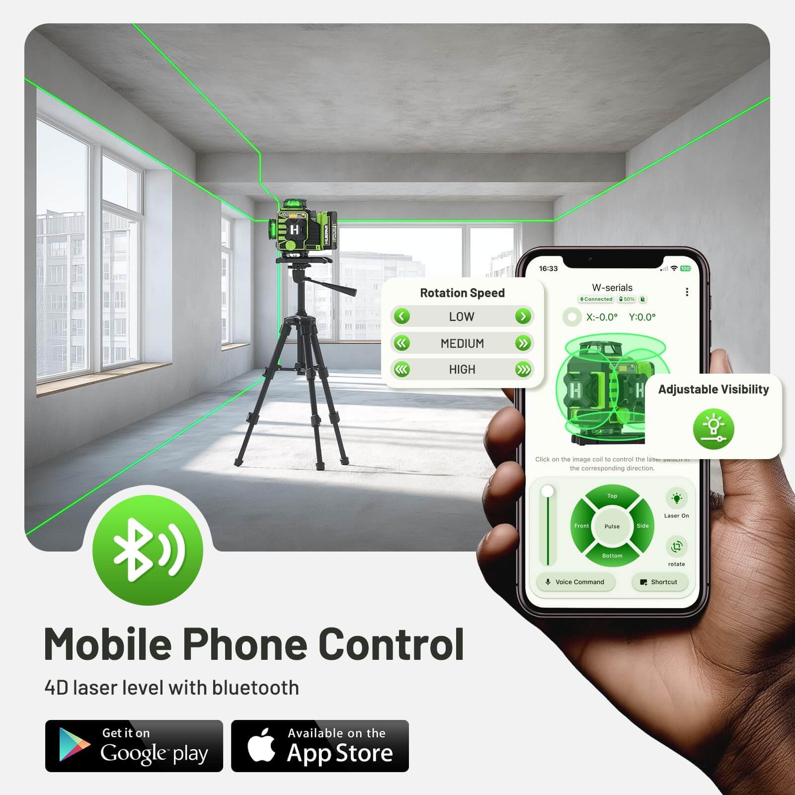 Tres opciones de control remoto (control remoto Bluetooth, aplicación móvil, operación del dispositivo) con activación instantánea del modo de pulso. El modo de pulso mejora la estabilidad en el sol al aire libre con un rango de trabajo que se extiende más allá de los 130Ft. Se integra perfectamente con todos los receptores de línea láser Huepar. (Recomendado para uso óptimo al aire libre, se vende por separado)