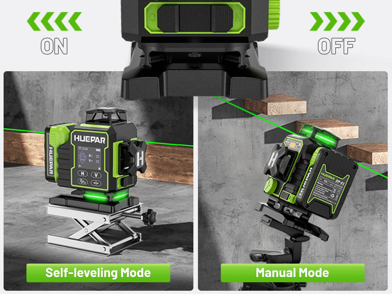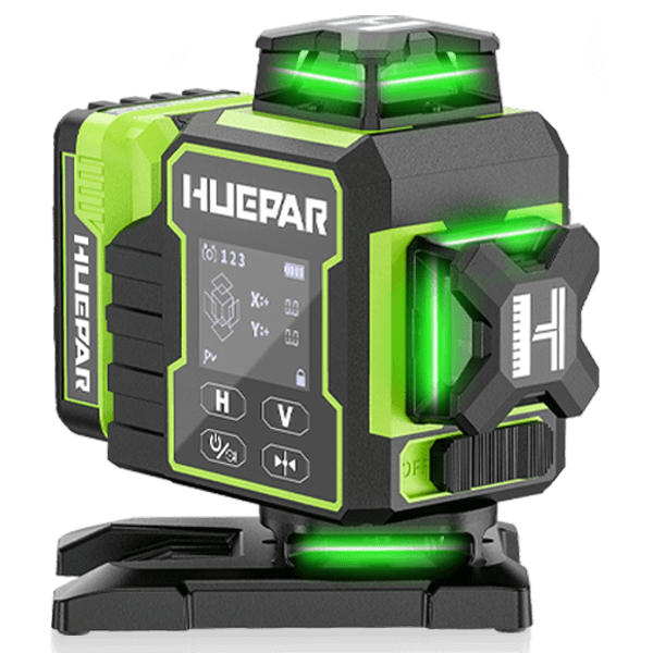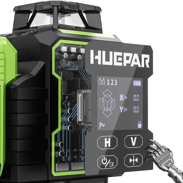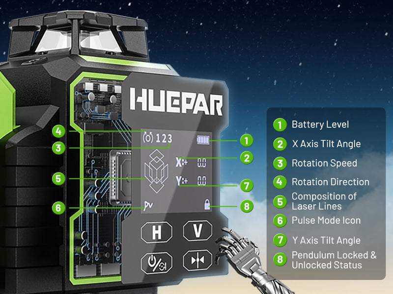 El nivel láser Huepar W04CG tiene una pantalla LCD de alta definición que garantiza una visibilidad clara de los parámetros esenciales incluso en entornos de baja luz. La pantalla proporciona información en tiempo real, incluyendo el nivel de batería, ángulos de inclinación X/Y, velocidad y dirección de rotación, composición de líneas láser, estado del modo de pulso y estado del péndulo.