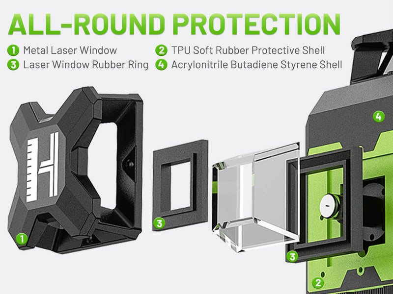 El nivel láser W04CG está diseñado con protección en todas direcciones para garantizar la durabilidad y confiabilidad en cualquier entorno de trabajo. Caracterizado por una ventana láser metálica y un anillo de protección de caucho para proteger los componentes críticos, un caso de caucho blando TPU y un gabinete ABS (Acrylonitrile Butadiene Styrene) para una resistencia a impactos aumentada, puede soportar condiciones duras mientras mantiene una operación precisa. No importa qué tan duras sean las condiciones.