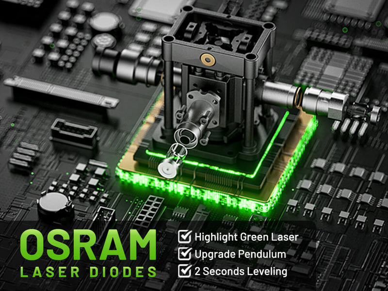 - German OSRAM: Equipado con diodo láser OSRAM alemán y sistema de péndulo mejorado, logrando un nivelado rápido de 2 segundos. El láser verde proporciona líneas de proyección brillantes y estables.