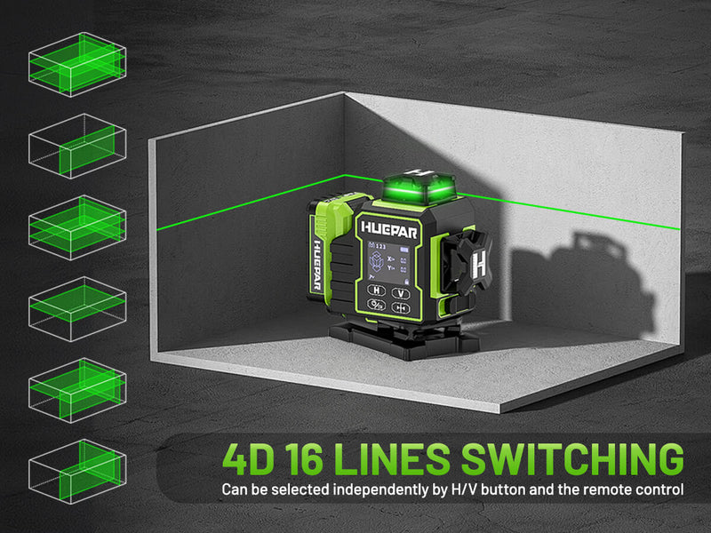 La cobertura integral de 16 líneas láser crea una cuadrícula de medición completa, garantizando precisión puntual cada vez. Con el interruptor H/V independiente, puede activar las líneas de manera flexible según sus necesidades específicas, mejorando la eficiencia del trabajo al ahorrar energía.